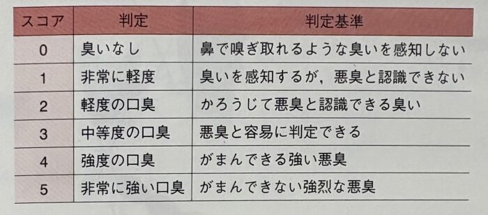 口臭検査法には、官能検査と口臭測定器による検査があります。官能検査は人の嗅覚で評価する方法です。この検査は正常な嗅覚を持つ人が行う必要があります。測定基準の(下の図)が2以上からは“口臭あり”と診断されます。
